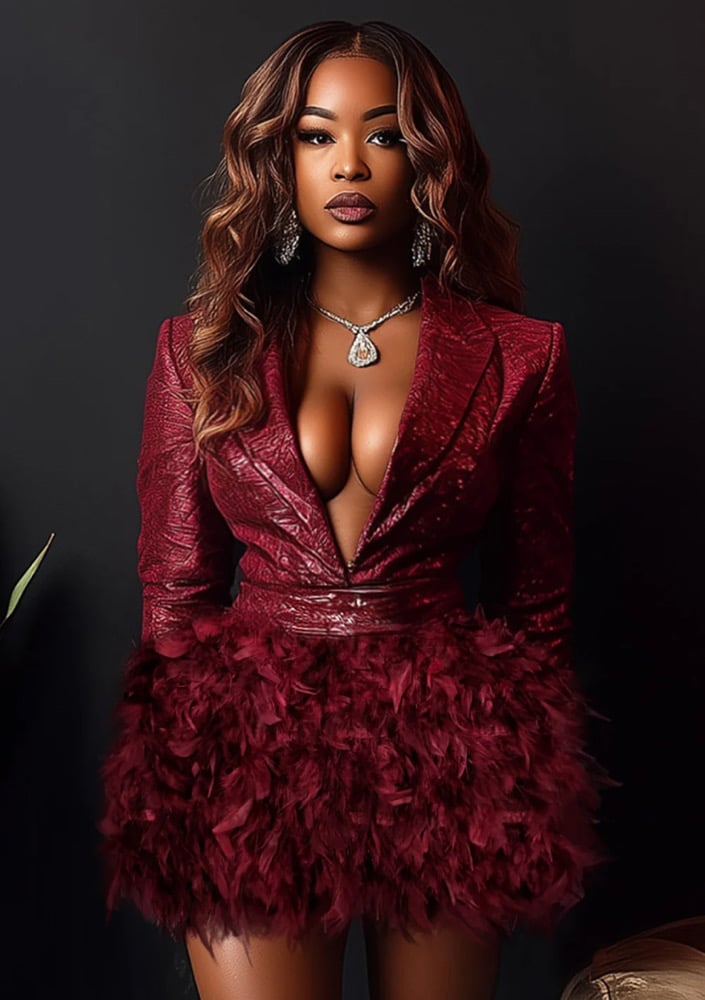 This burgundy blazer dress brings all the drama in the best way — tailored up top for a sleek, boss-babe vibe and finished with a feathered bottom for that playful, feminine touch. Perfect for holiday parties, birthday dinners, or any night you want to stand out and feel unforgettable.
