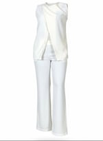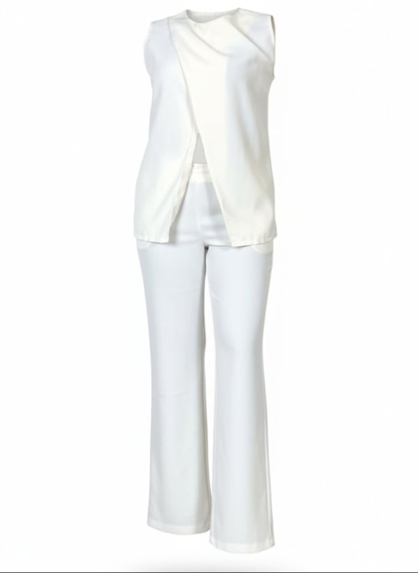 This chic two-piece set features a sleeveless ivory/cream top with a front overlap detail and matching straight-leg trousers. The outfit is crafted from a smooth, satin-like fabric that offers a soft sheen and elegant drape β perfect for both dressy daytime events and evening occasions.