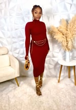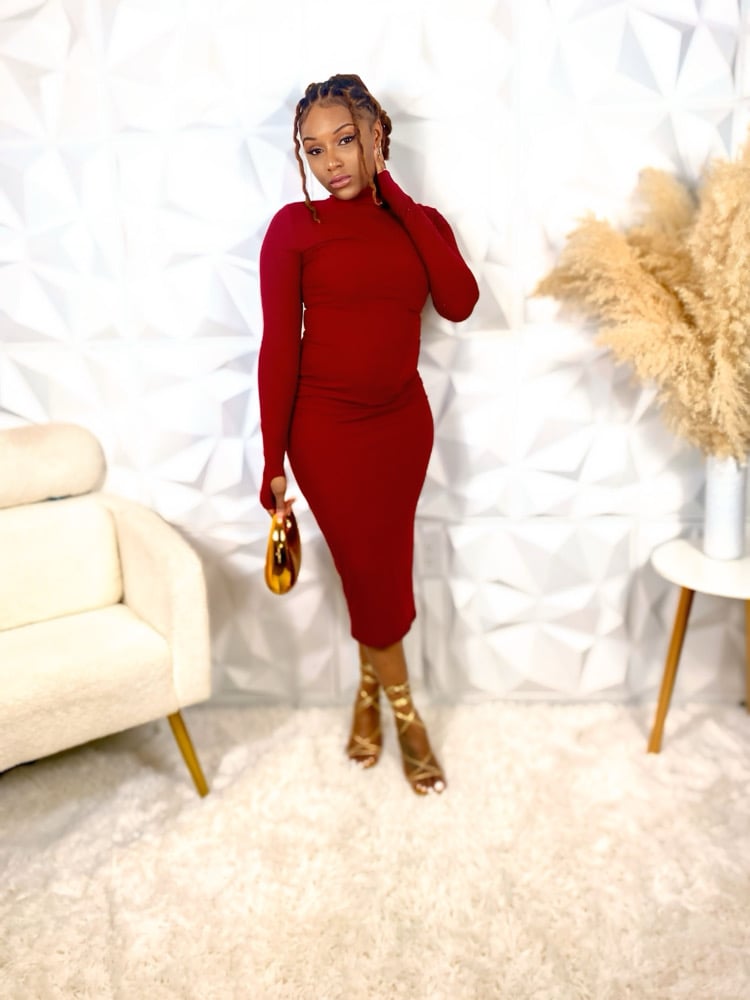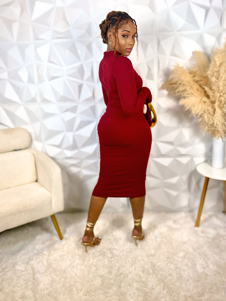 The dress in the image is a long-sleeve bodycon midi dress in a deep wine red shade.