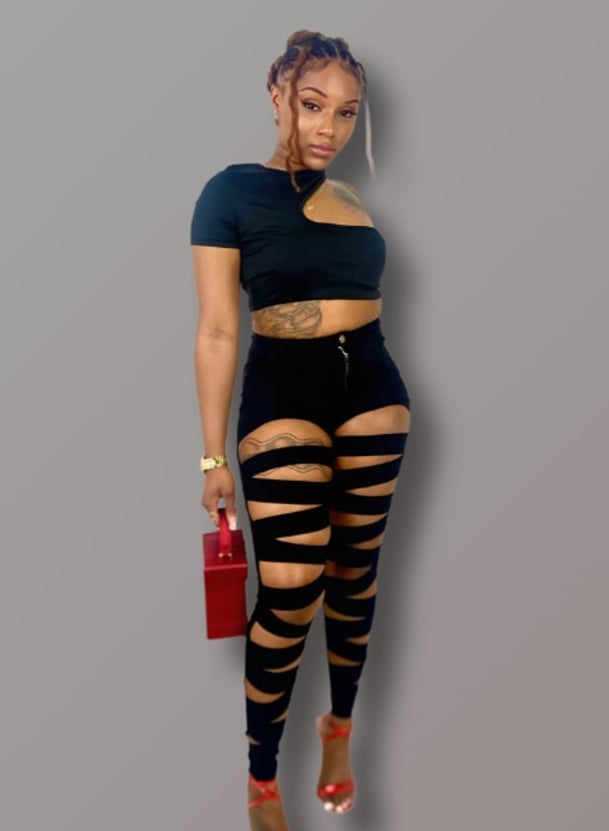 • Sleek black one-shoulder crop top with a bold cutout detail