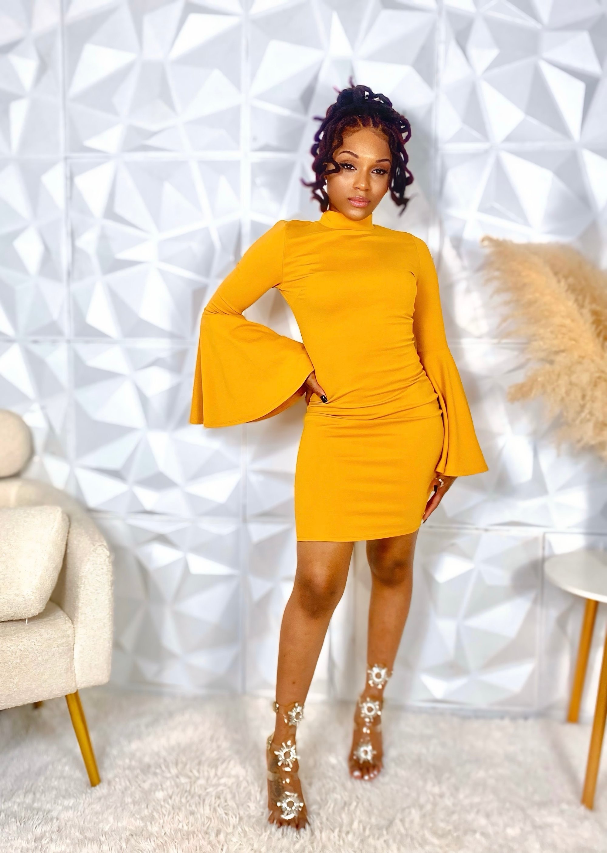 This is a bold and chic mustard-yellow bodycon mini dress made with a smooth, stretchy knit fabric that hugs your curves in all the right places. The standout detail is the dramatic bell sleeves, adding flair and elegance while keeping the look modern.